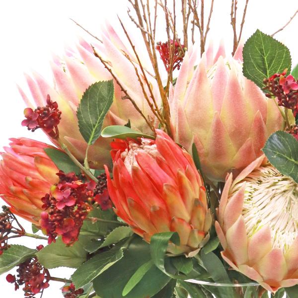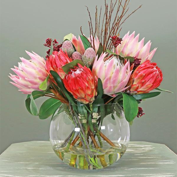 Mauve artificial King & Queen Protea stems with twigs set in a clear glass rose vase.