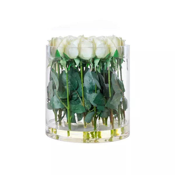 Mint artificial silk Rose buds set inside a clear glass vase.