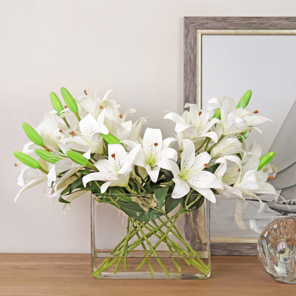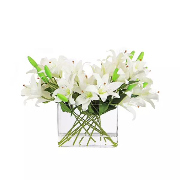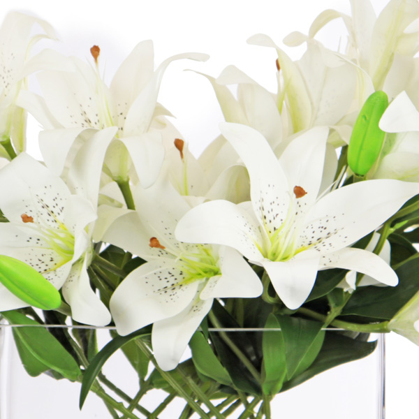 White artificial Tiger Lily stems set in a clear glass rectangular vase.