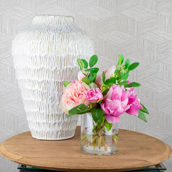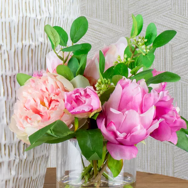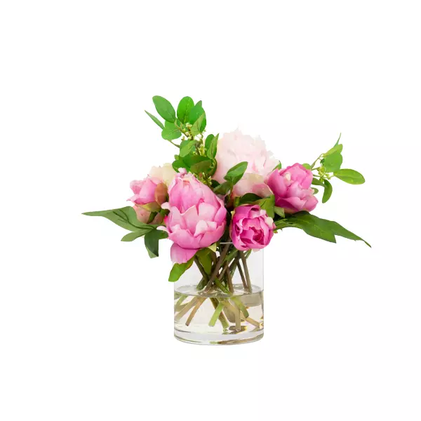 Artificial Mixed Peony Stems and Foliage set in a clear glass vase.