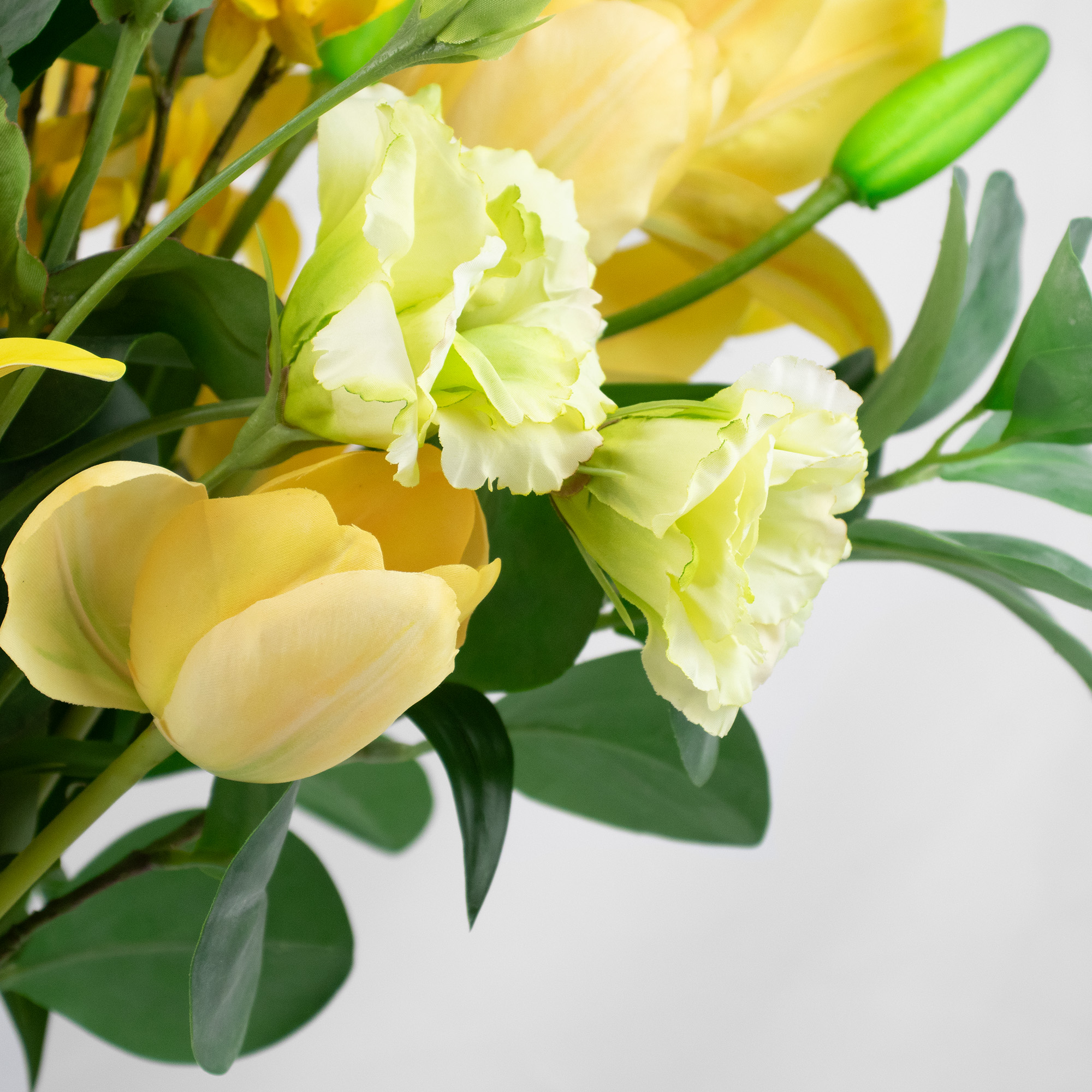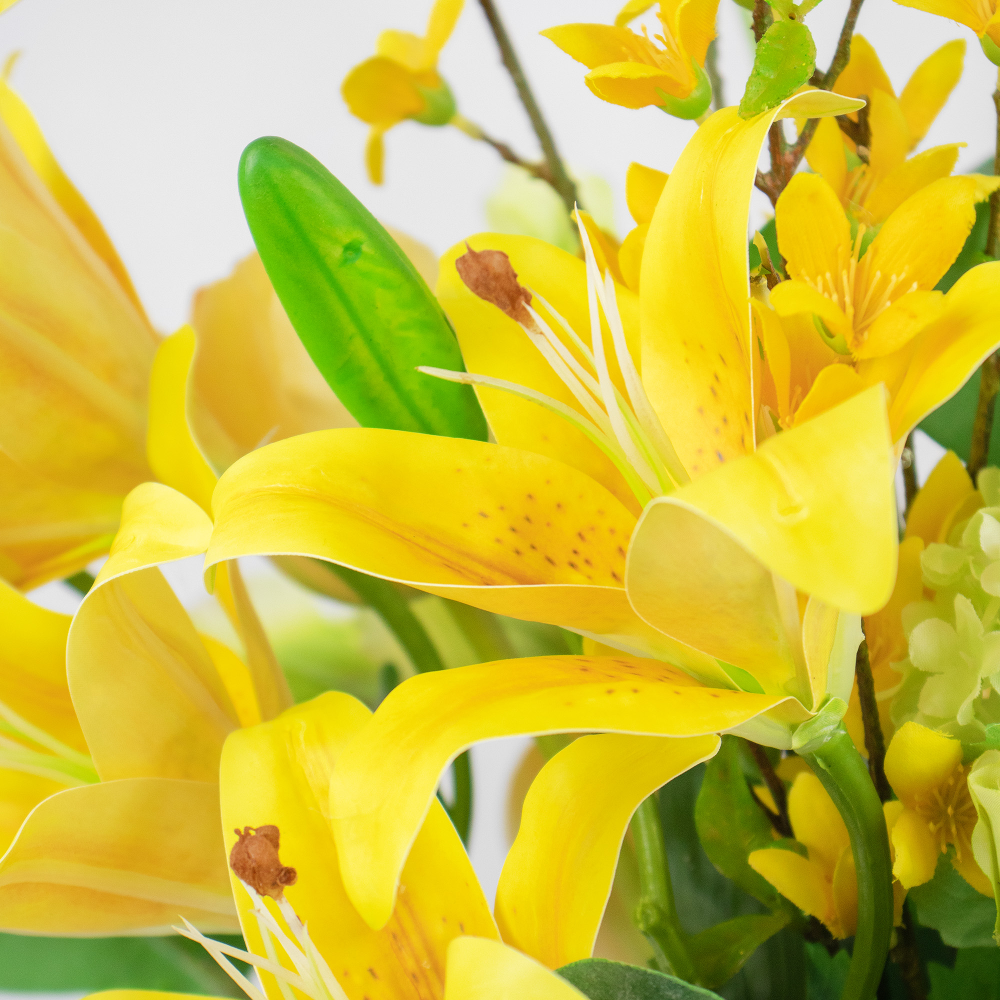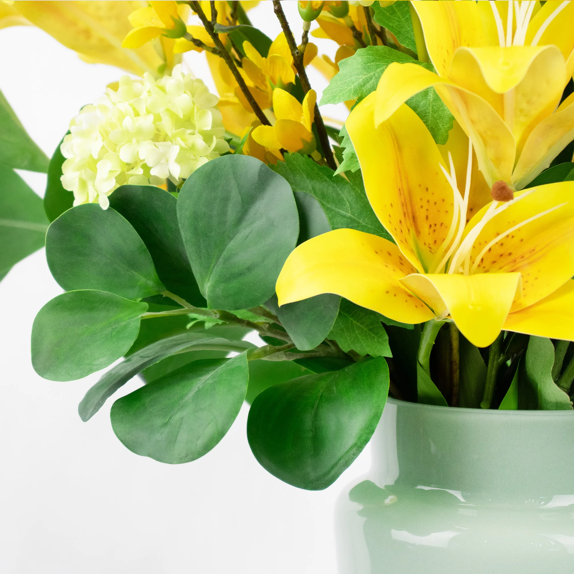 Artificial Yellow Tiger Lily flower arrangement with forsythia and green foliage set in a green glass vase.