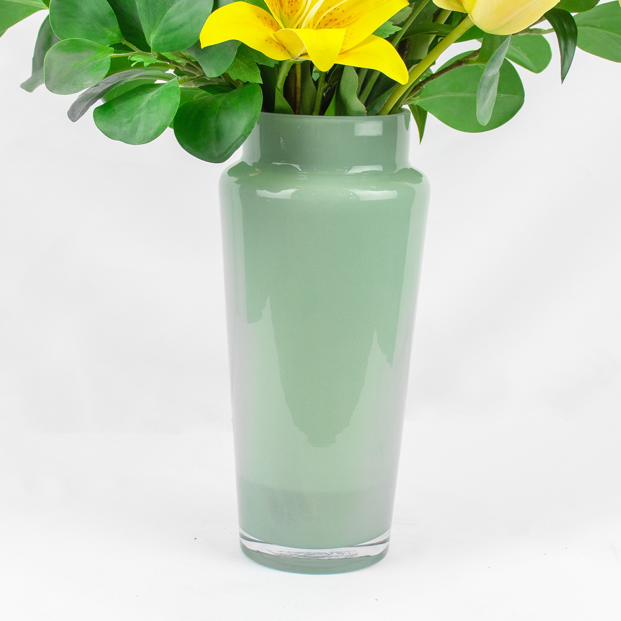YELLOW LILY WITH FORSYTHIA IN SAGE GREEN GLASS VASE