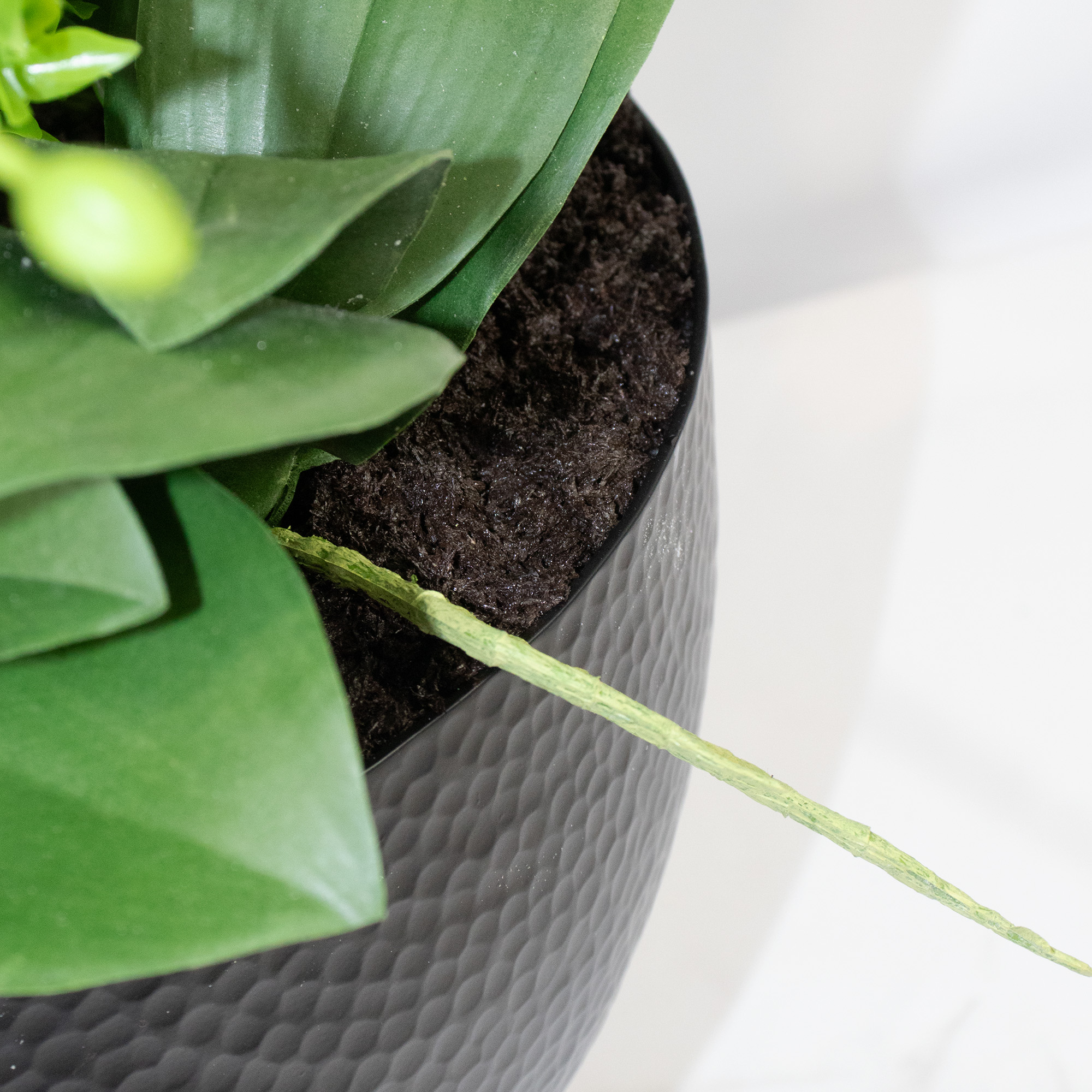 White artificial silk Phalaenopsis orchids set in a medium black hammered metal planter.